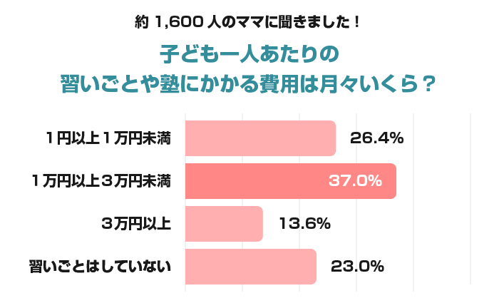 参考文献:mamastaセレクト|4割のママが3万円未満と回答。子どもの塾や習い事にかける金額は?<ママのリアル調査> ※ママスタセレクト調べ「子どもの習い事の費用について」2023年9月回答数1,636名