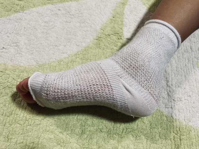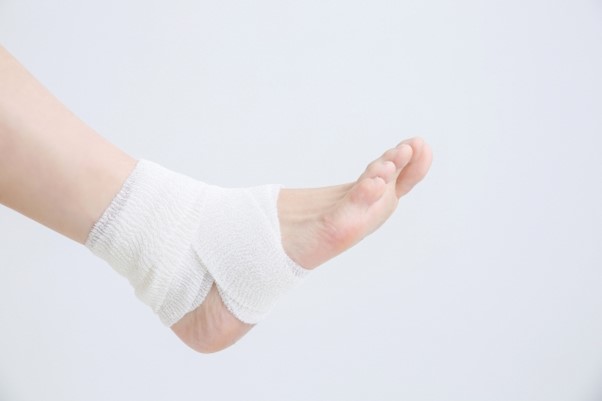 テーピングや包帯などを巻いて、可能な限り足関節を固定しましょう。