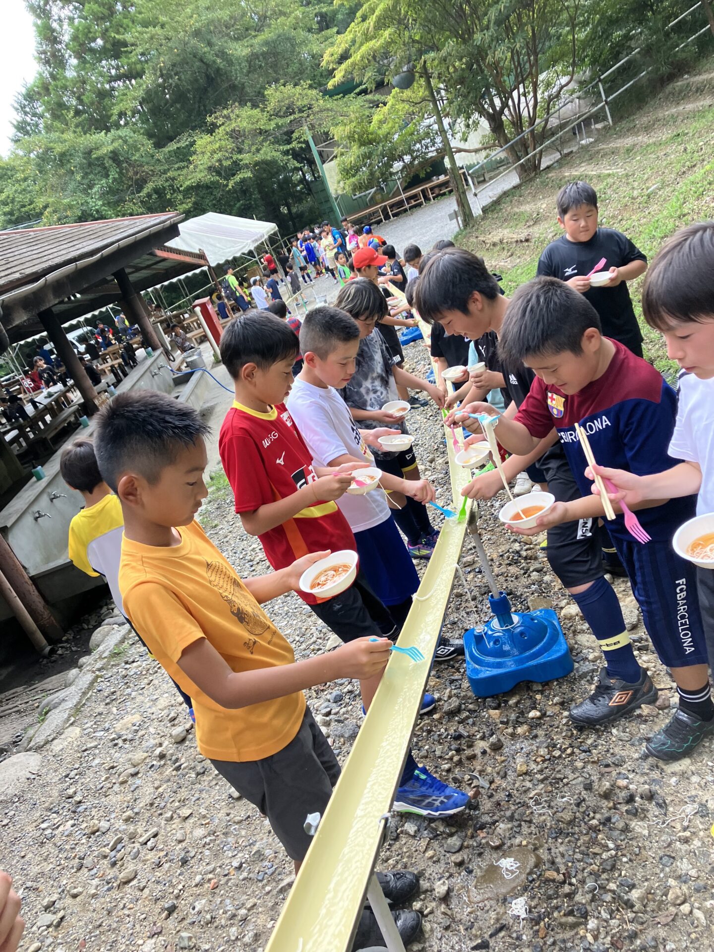 とはいえ、油断禁物、長時間の活動は熱中症リスクにも繋がるため、2日目は早めにサッカーを切り上げて流しそうめんを行いました☆本場の竹を使った流しそうめんに子供たちも大満足!